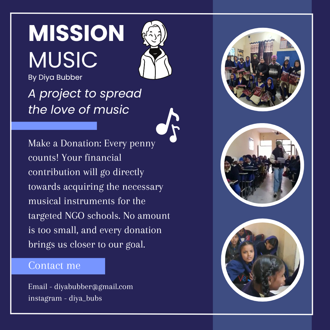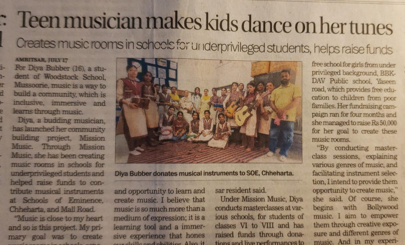 I am Diya Bubber, a 16-year-old student studying at Woodstock School in Mussoorie. I have initiated a community project called Mission Music, with the primary goal of creating music rooms in schools for underprivileged students. Through masterclasses, presentations, and instrument donations, I aim to empower these students by providing them access to creative avenues and exposure to different genres of music.